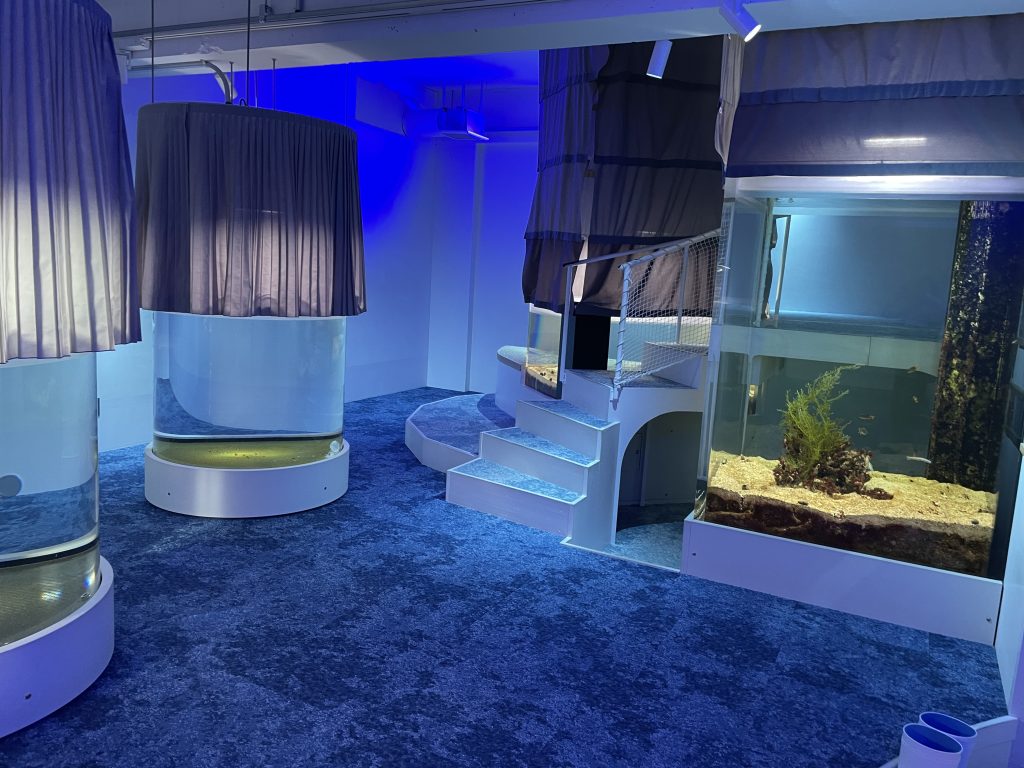 たくさんの水槽が、低い位置に設備されています。